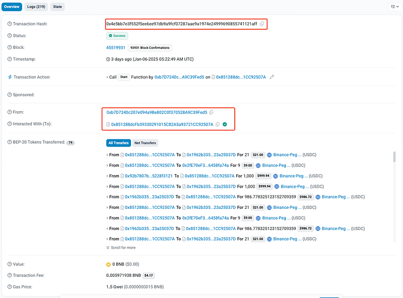 On January 8, 2025, the Mosca contract on Binance Smart Chain (BSC) was exploited due to incorrect balance calculations in the exitProgram function. The vulnerability allowed the attacker to withdraw tokens multiple times by exploiting improper state updates. The exploit resulted in a total loss of approximately $19.5K.