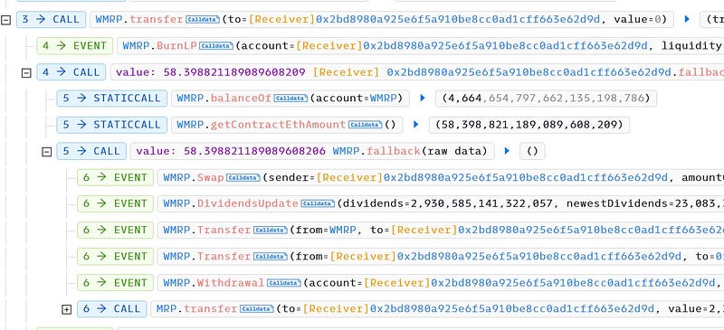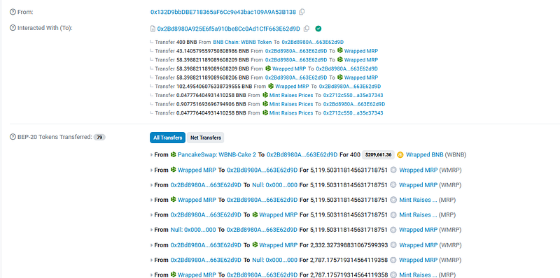 - This vulnerability allowed the hacker to exploit the contract by repeatedly calling the receive() function within the _transfer() function, thereby accumulating a large amount of MRP tokens.