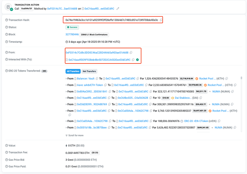 rETHand 631,422$NUMAvia flash loans (Aave V3,Balancer,Uniswap V3,apNUMA), depositedrETHinto Numa, and mintedcrEthusingNumaComptroller.enterMarkets, exploiting the lack of flash loan safeguards.