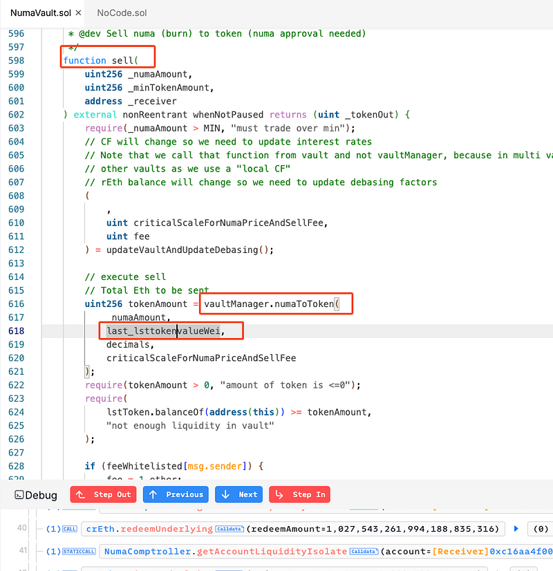 NumaVaultcontract’ssell()function. This flaw allowed the attacker to manipulate thelast_lsttokenvalueWeivariable using a massive flash loan, bypassing the protocol’s zero-slippage trading promise.