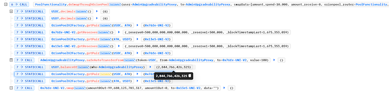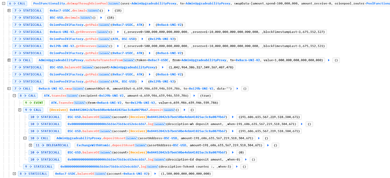 depositAsset()function after which a flash loan of 191,606 USDC was passed toswapThroughOrionPool()function to swap USDC via the path (USDC-ATK-USDT).