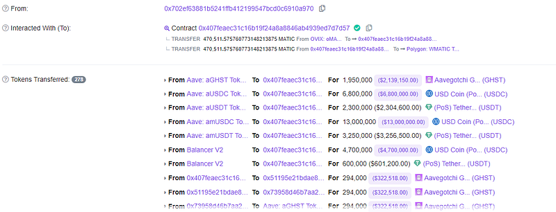 - The attacker performed a series of transactions to borrow vGHST tokens worth 5.4 million USDT and 720 thousand USDC. The attacker borrowed a lump sum of vGHST tokens, which caused the price oracle to be altered as it was dependent on the conversion from vGHST to GHST.