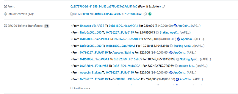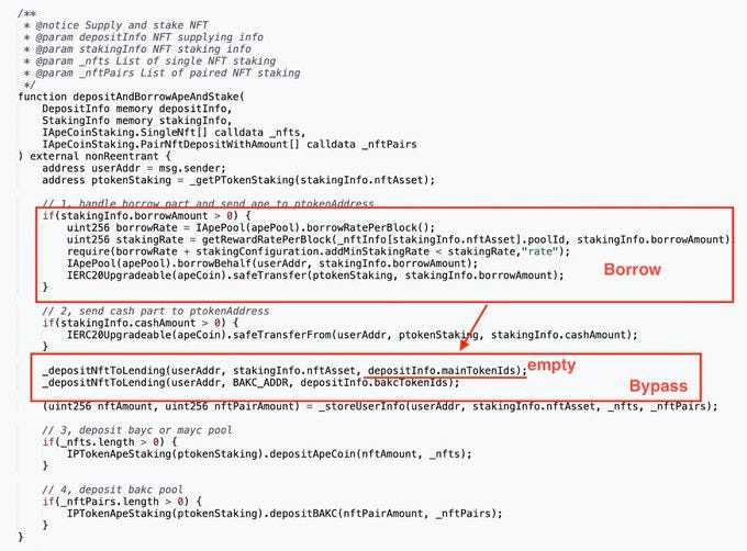 - The attacker took advantage of the contract by borrowing APE tokens using an NFT that was already staked in the APE Staking Pool.