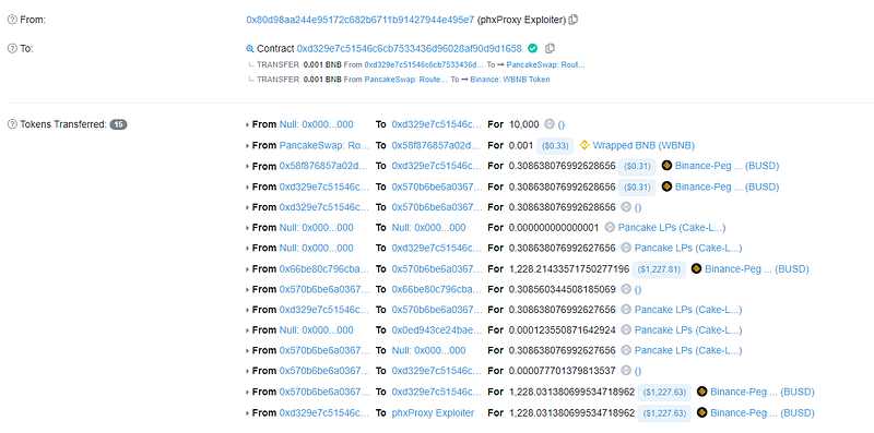 - The attacker first created fake BUSD token pair and then moved them to Pancake Swap using phxProxy.