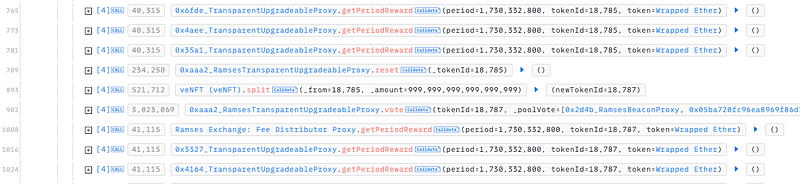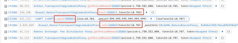 · The attacker exploited this flaw by depositing tokens using an NFT, claiming rewards, and then resetting or splitting the NFT into a new tokenId (e.g., 18785 to 18787). This reset action allowed them to bypass the claim-tracking variable veWithdrawnTokenAmountByPeriod and repeatedly claim rewards as if they were distinct NFTs, despite having already claimed rewards in that period.