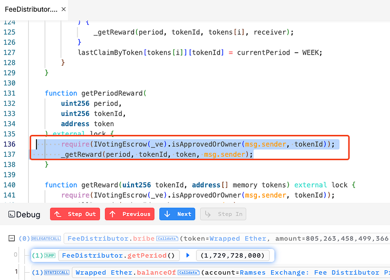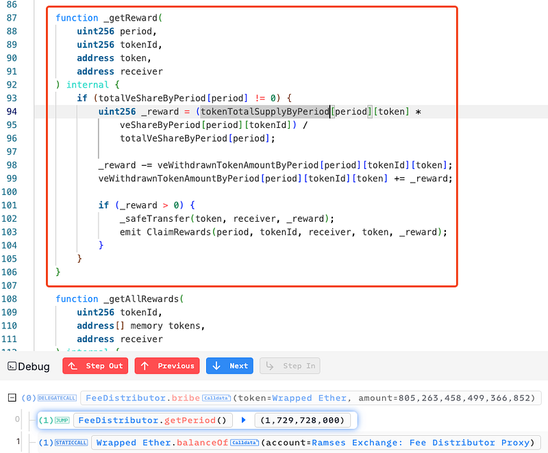 · The getPeriodReward() function does not verify if the specified period aligns with the current time. By specifying arbitrary period values, the attacker could access previously unclaimed rewards from earlier periods. This oversight in timestamp validation enabled them to retroactively claim inflated rewards that should have been restricted to active periods only.