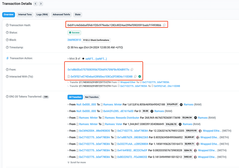 On October 24th, 2024, the Ramses Exchange (@RamsesExchange) on Arbitrum suffered a loss of nearly $93,000 due to a flaw in its reward distribution logic. The vulnerability allowed the attacker to repeatedly claim rewards across multiple tokenIds without a corresponding reduction in the total rewards supply. By depositing tokens and invoking getPeriodReward() with different NFTs, the attacker drained reward pools, exploiting the contract’s failure to adequately track reward limits per period. The exploit primarily targeted accumulated incentives and fees rather than the underlying liquidity provider funds.