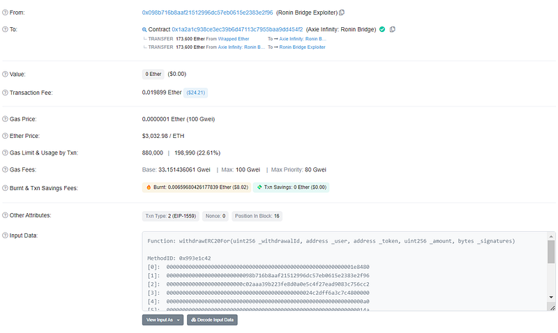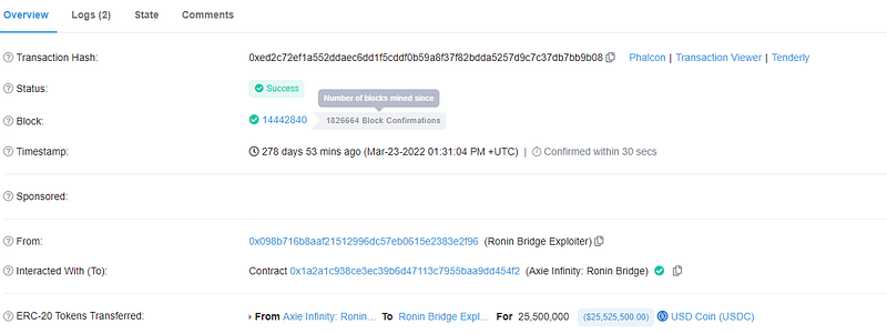 On March 29, Ronin officially reported that the Ronin Bridge had been hacked due to a private key theft. The hackers took 173,600 ETH and 25.5 million USDC, which at the time amounted to almost $625 million.