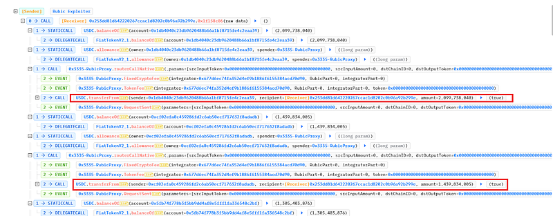 - Thus, the attacker used the routerCallNative() function to call the USDC contract and transferred the USDC tokens from the users’ accounts who had previously approved the RubicProxy contract to their address.