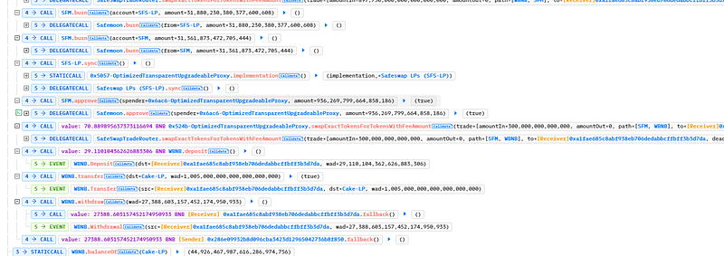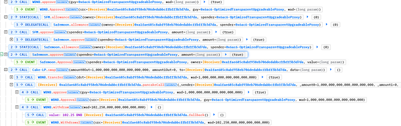 - The attacker initially purchased around 102 WBNB tokens before exchanging them for their SFM pair counterpart.