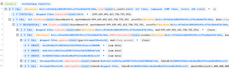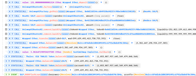 - Three fraudulent tokens were produced as part of the attack, which began with a flashloan of 400 ETH from the DVM contract.