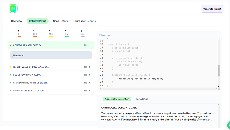Our cloud-based smart contract security scanner SolidityScan can automatically find vulnerabilities related to insecure delegate calls.