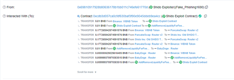 - Exploiting a price difference between the PancakeSwap V2: SHIDO-WBNB pool and the PancakeSwap V2: SHIDO pool, the attacker exchanged the increased SHIDO tokens for 1,016 WBNB (compared to the initial 40 WBNB used in the first swap).