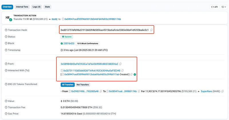 The stolen funds, valued at ~$730,000, remain in the attacker’s contract and have not yet been swapped yet. Notably, the $RARE token itself was unaffected, with the exploit limited to the staking contract’s reward pool.