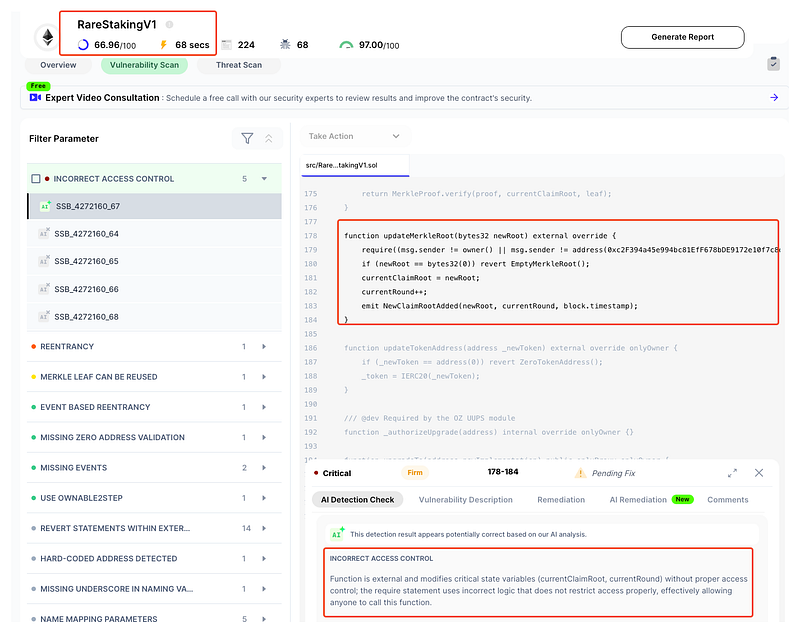 - Try it yourself at: https://solidityscan.com ! Sign up and scan the Victim Contract (RareStakingV1) on Ethereum (Mainnet). A detailed vulnerability report will be ready in just few seconds!