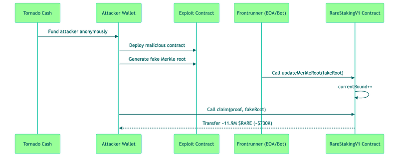 On July 28, 2025, SuperRare’s (@SuperRare) RareStakingV1 contract was exploited for approximately $730,000 USD (~11.9M RARE tokens). The vulnerability stemmed from a broken access control check in the updateMerkleRoot() function, allowing any unauthorized users to submit malicious Merkle roots. This enabled an attacker to calculate a malicious Merkle root, submit it via a frontrunner transaction, and fraudulently claim the tokens. This vulnerability falls under OWASP SC01: Access Control Vulnerabilities.