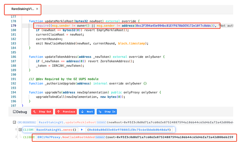 RareStakingV1contract lies in a critical logic flaw in access control within theupdateMerkleRootfunction. - The