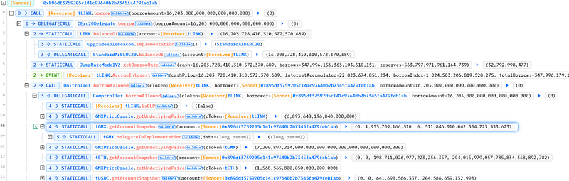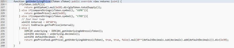 - The GMXPriceOracle.getUnderlyingPrice() method used in the borrowing process had a mistake that caused the starting price to be multiplied by both 1e20 and 1e10, which caused the price of tGMX tokens to rise sharply.