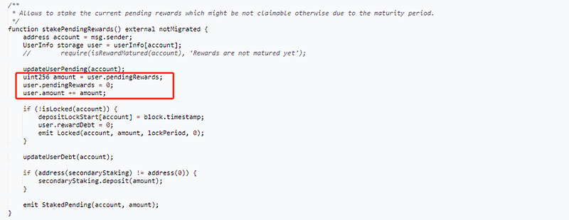 receiveUpPool()andwithdraw()to accumulate rewards. - Further, the attacker utilised stakePendingRewards to convert the collected rewards into staking amounts.