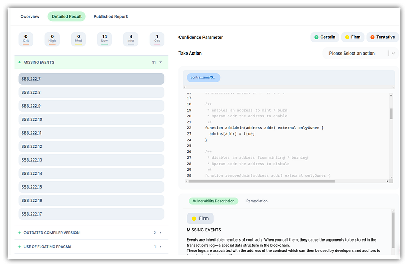 Our product SolidityScan detects missing events on critical functions and performs 100+ vulnerability and code optimization checks.