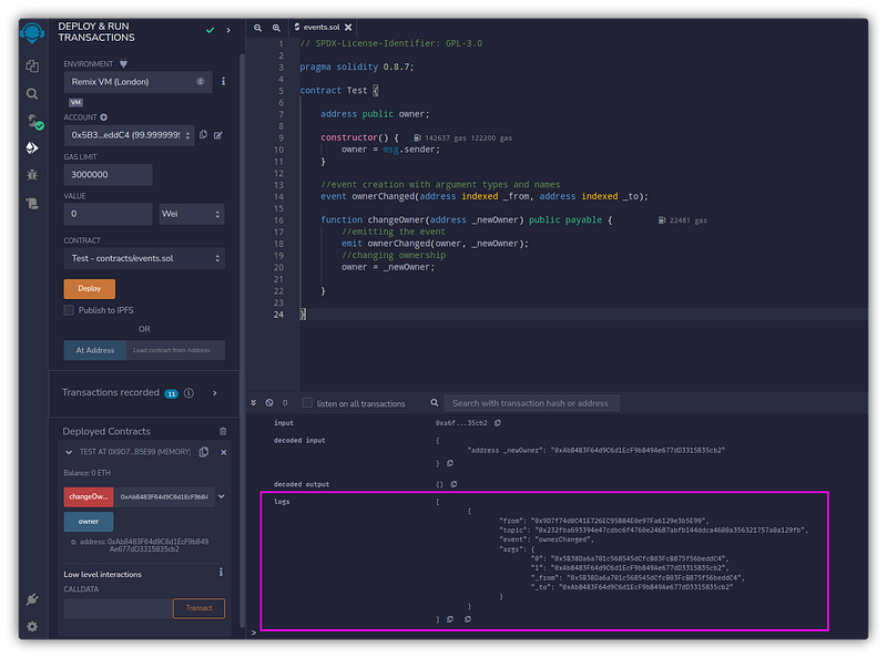 When the function changeOwneris called, the emitted event can be seen in the logs section of the Remix IDE, along with the arguments passed while updating the owner.