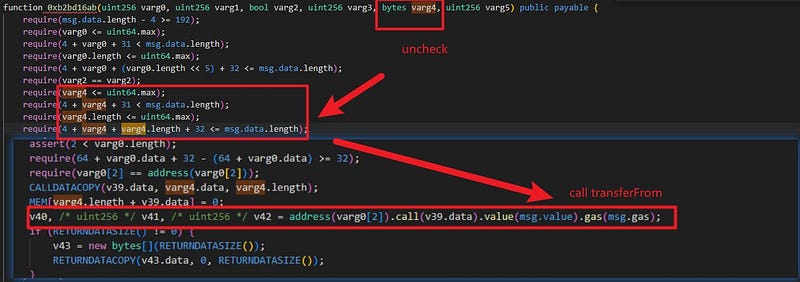 The root cause is a Call Injection. This vulnerability enabled attackers to inject their own malicious data into the 0xb2bd16ab() method, which subsequently allowed them to transfer tokens that were approved to Unibot contracts.