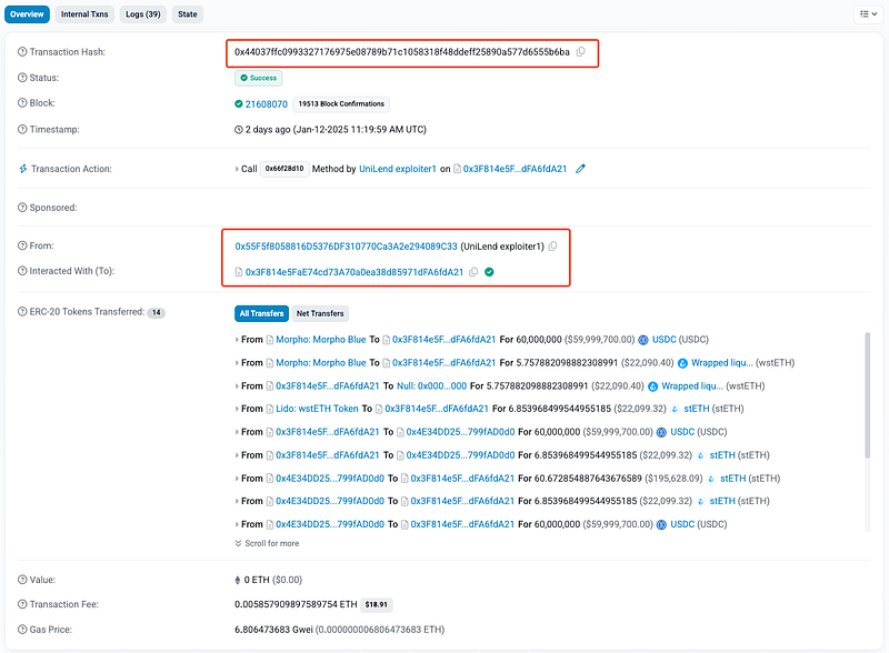 On January 13, 2025, the UniLend V2 (@UniLend_Finance) contract on Ethereum was exploited due to incorrect health factor validation in the redeemUnderlying function. The flaw allowed an attacker to manipulate share prices and inflate collateral value, leading to improper health factor calculations. This enabled the attacker to withdraw collateral without adequate checks, resulting in a loss of approximately 61 stETH (~$200k).