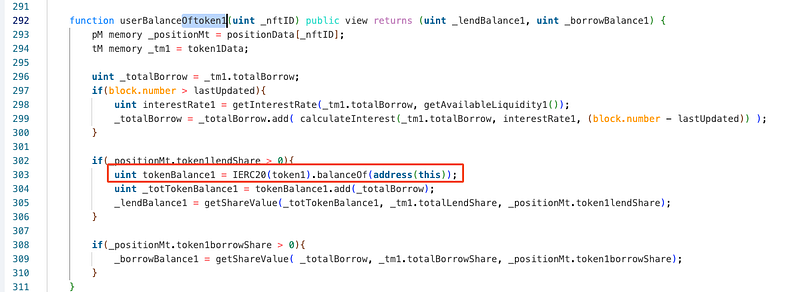 userBalanceOftoken1function calculateslendBalanceusing the following logic:_lendBalance1 = getShareValue(_totTokenBalance1, _tm1.totalLendShare, _positionMt.token1lendShare); - Here,