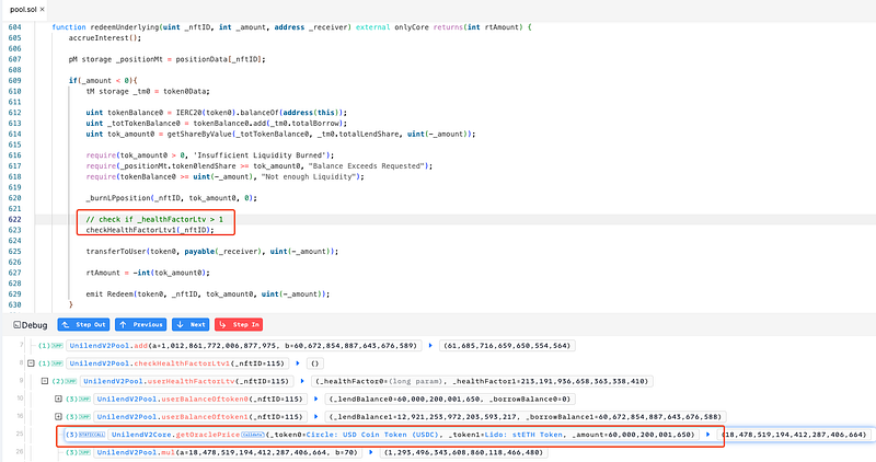 redeemUnderlyingfunction. - By exploiting the flawed health factor validation, they managed to withdraw all their USDC while keeping the stETH collateral, resulting in a net gain of approximately 61 stETH (~$200K).